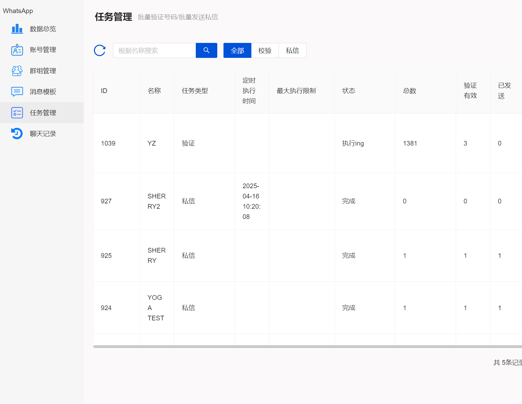 账号管理、群组管理、营销任务管理、聊天记录